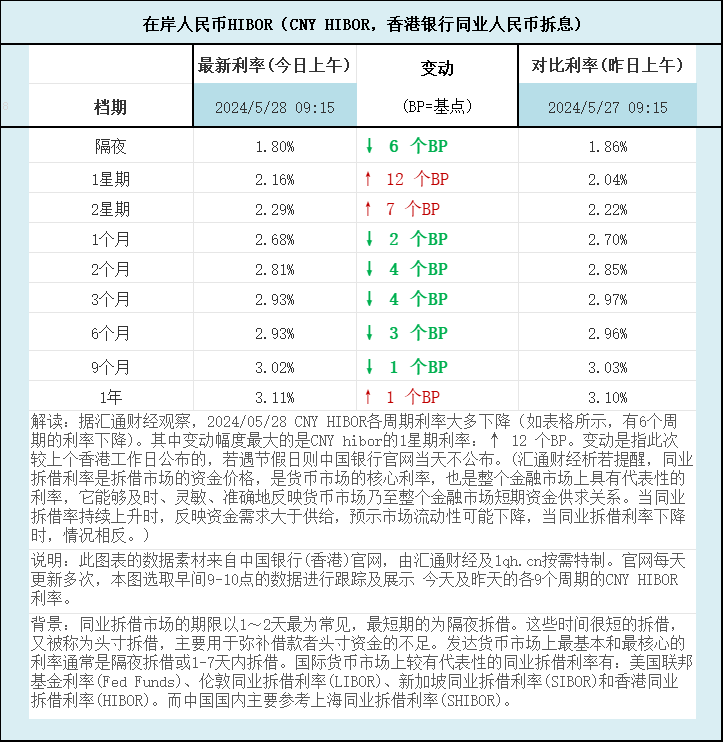 人民币香港银行间同业拆借利率(CNY HIBOR)及变动一览:据汇通财经观察,2024/05/28 CNY HIBOR各周期利率大多下降(如表格所示,有6个周期的利率下降)。其中变动幅度最大的是CNY hibor的1星期利率:↑ 12 个BP。如图更新的数据显示,隔夜在岸人民币HIBOR报1.80%,降6个BP;1星期报2.16%,升12个BP,2星期报2.29%,升7个BP,1