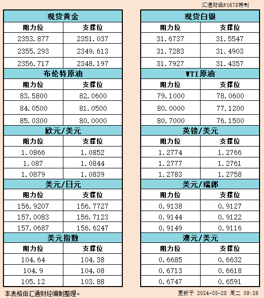 5月28日亚市支撑阻力:金银原油+美元指数等六大货币对