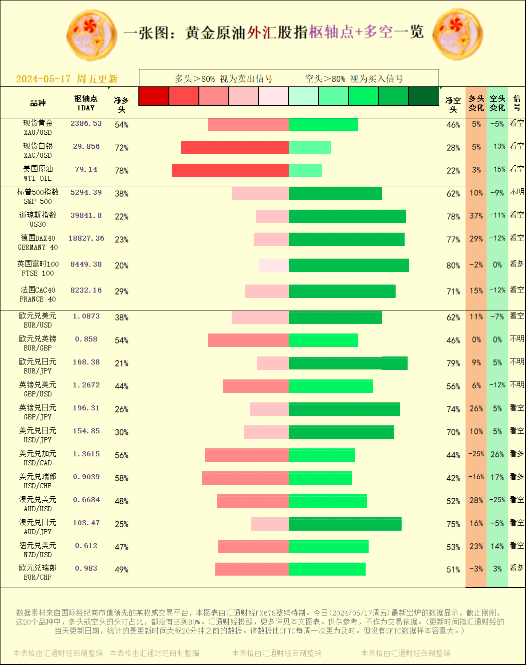 一张图:2024/05/17黄金原油外汇股指"枢纽点+多空占比"一览