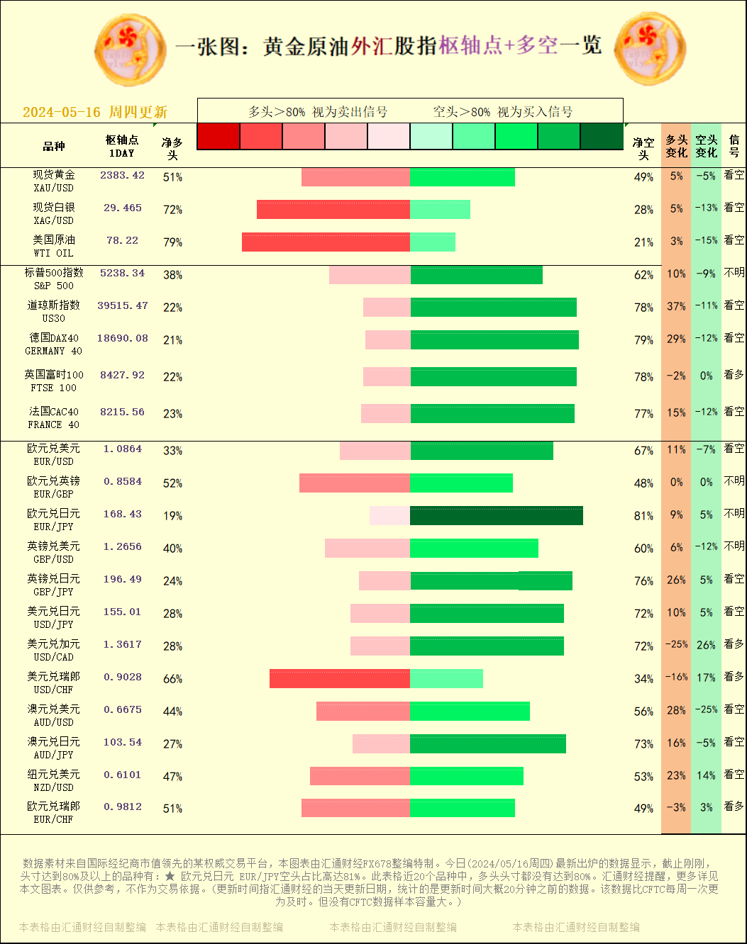 一张图:2024/05/16黄金原油外汇股指"枢纽点+多空占比"一览