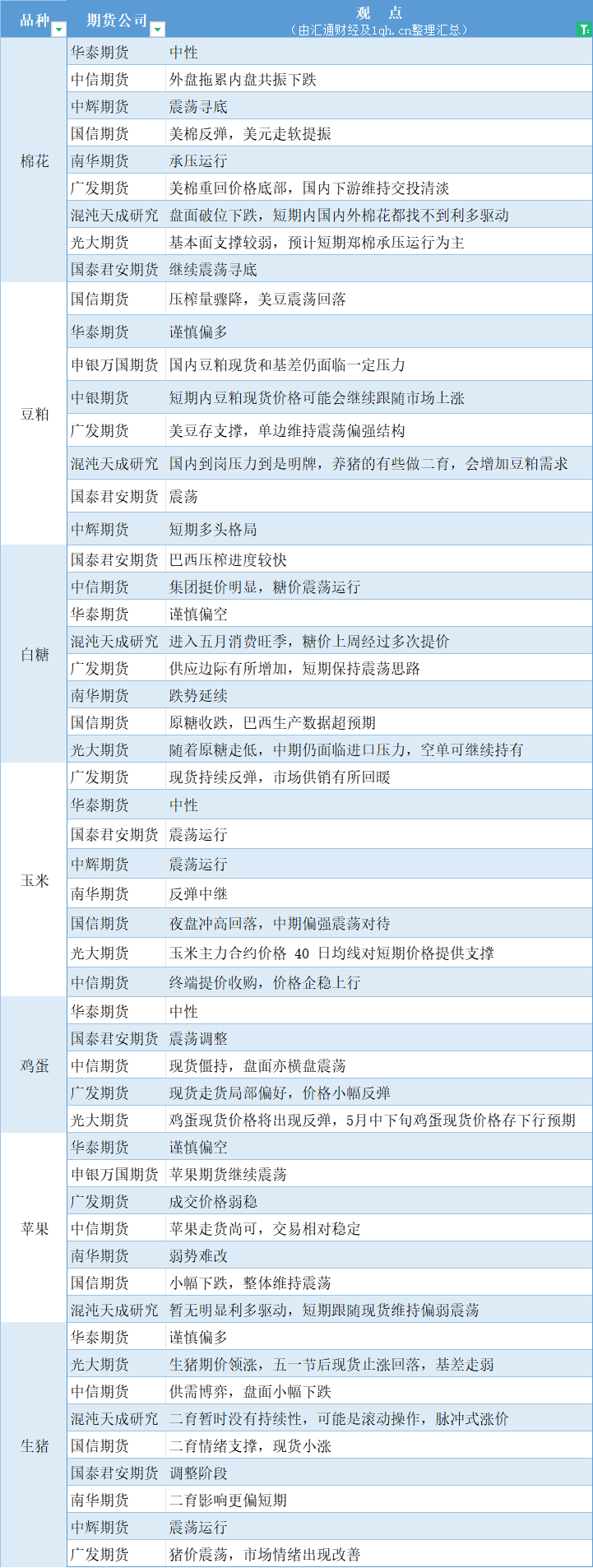 期货公司观点汇总一张图:5月16日农产品(棉花、豆粕、白糖、玉米、鸡蛋、生猪等)
