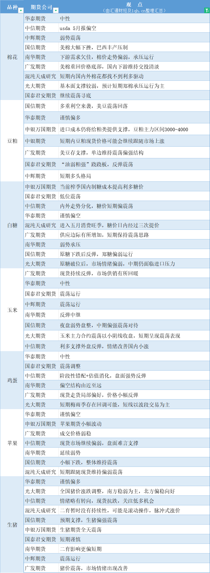 期货公司观点汇总一张图:5月15日农产品(棉花、豆粕、白糖、玉米、鸡蛋、生猪等)