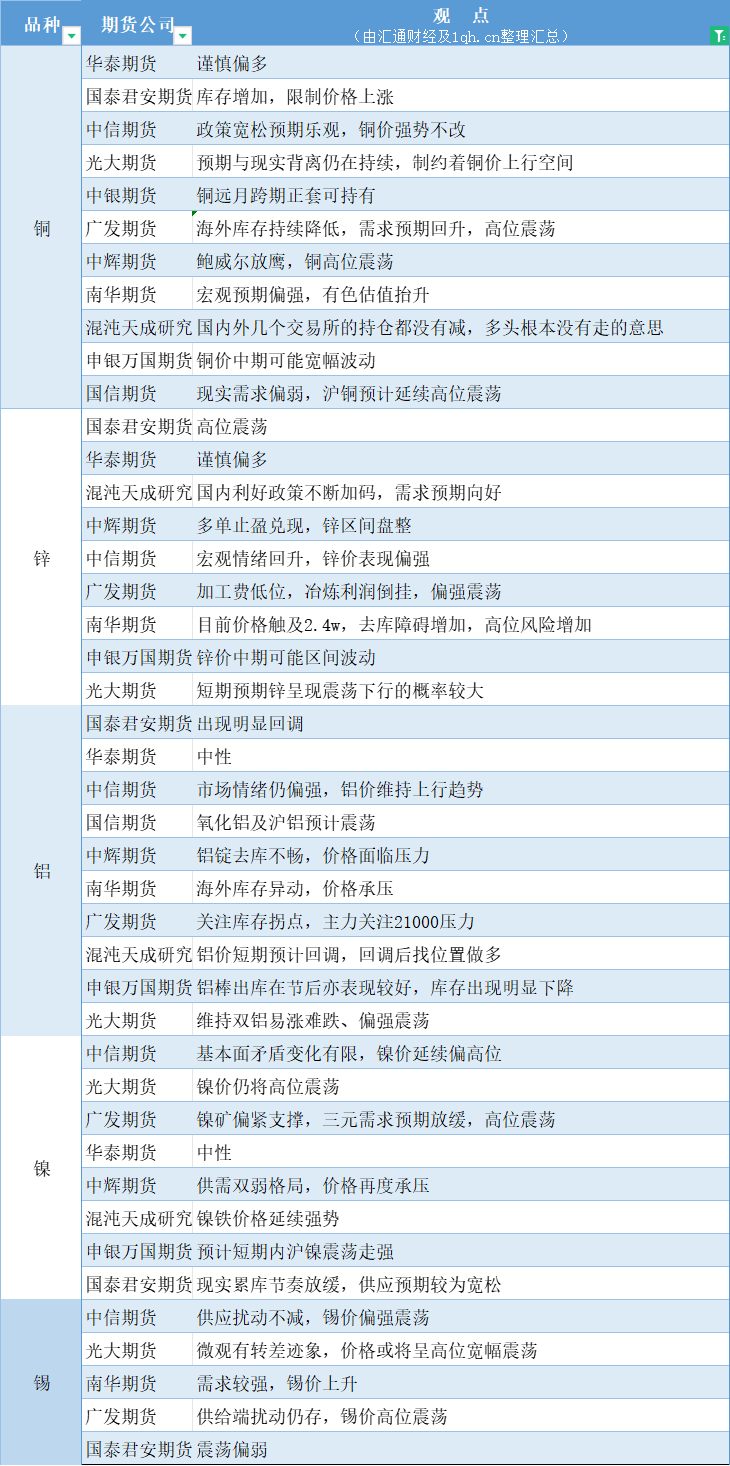 期货公司观点汇总一张图:5月15日有色系(铜、锌、铝、镍、锡等)