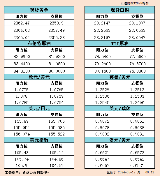 5月13日亚市支撑阻力:金银原油+美元指数等六大货币对