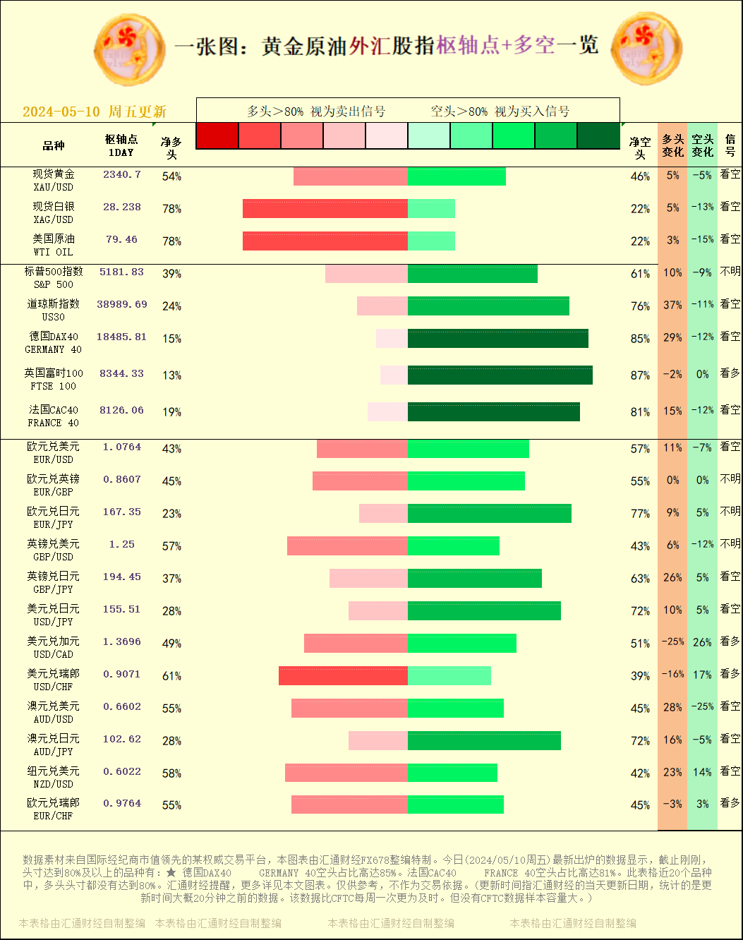 一张图:2024/05/10黄金原油外汇股指"枢纽点+多空占比"一览