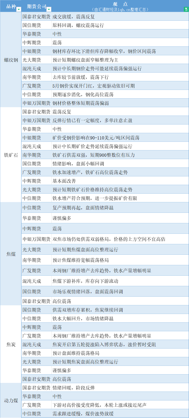 期货公司观点汇总一张图:5月10日黑色系(螺纹钢、焦煤、焦炭、铁矿石、动力煤等)