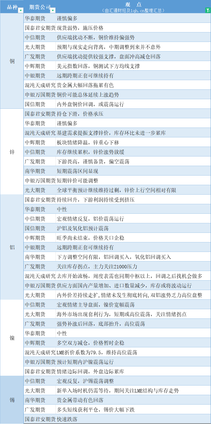 期货公司观点汇总一张图:4月24日有色系(铜、锌、铝、镍、锡等)