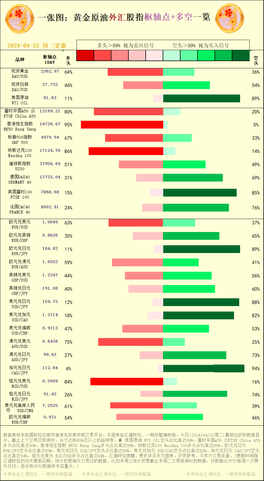 一张图:2024/04/23黄金原油外汇股指"枢纽点+多空占比"一览