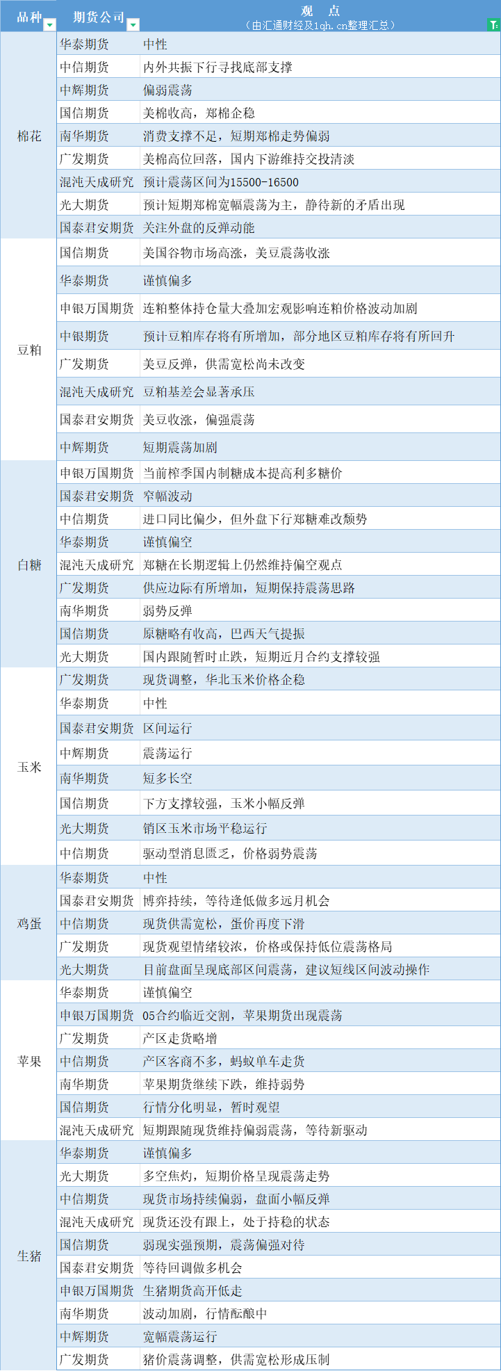 期货公司观点汇总一张图:4月23日农产品(棉花、豆粕、白糖、玉米、鸡蛋、生猪等)