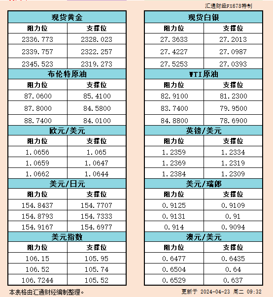 4月23日亚市支撑阻力:金银原油+美元指数等六大货币对
