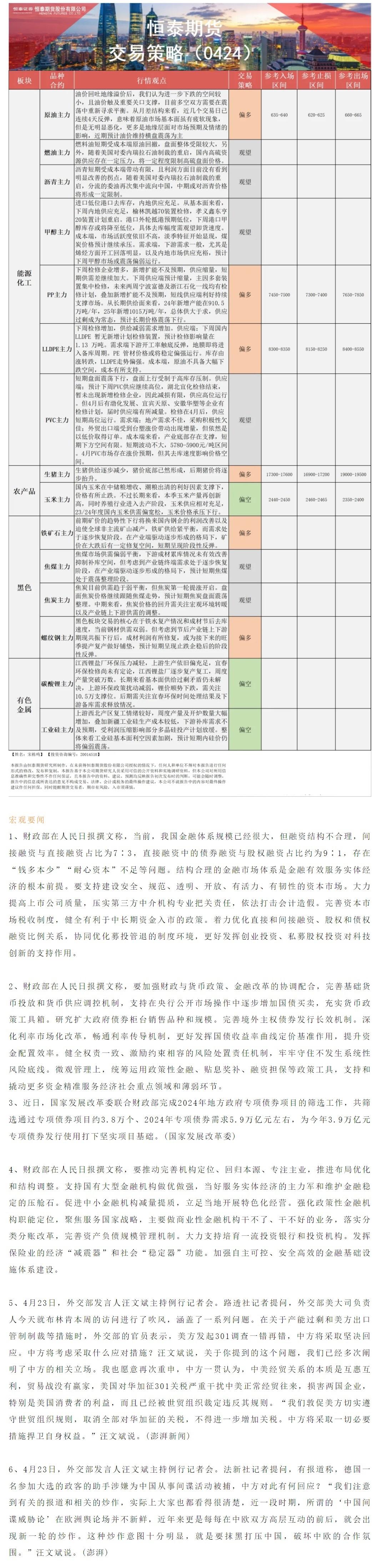 恒泰期货4月24日早间交易策略