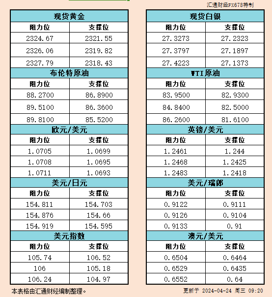 4月24日亚市支撑阻力:金银原油+美元指数等六大货币对