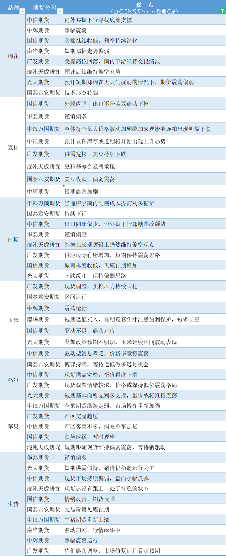 期货公司观点汇总一张图:4月19日农产品(棉花、豆粕、白糖、玉米、鸡蛋、生猪等)