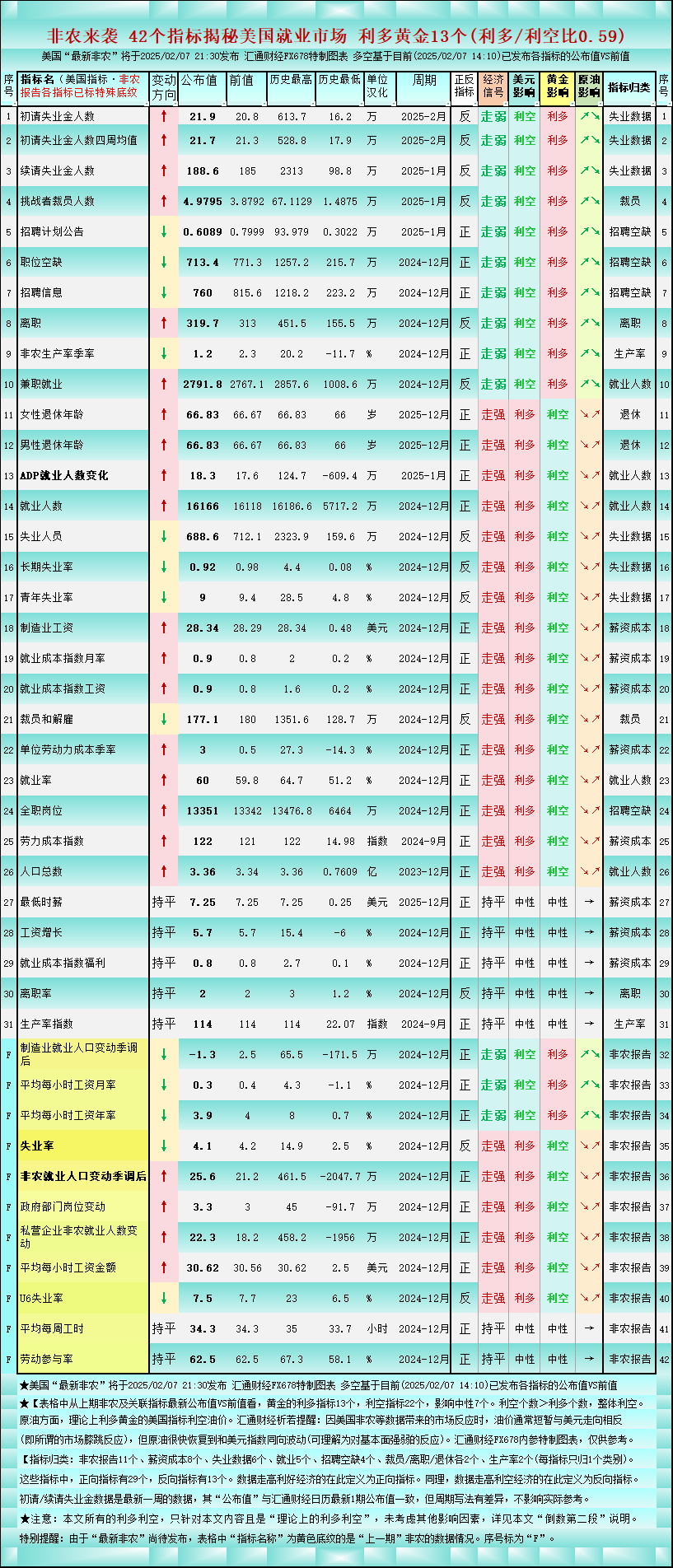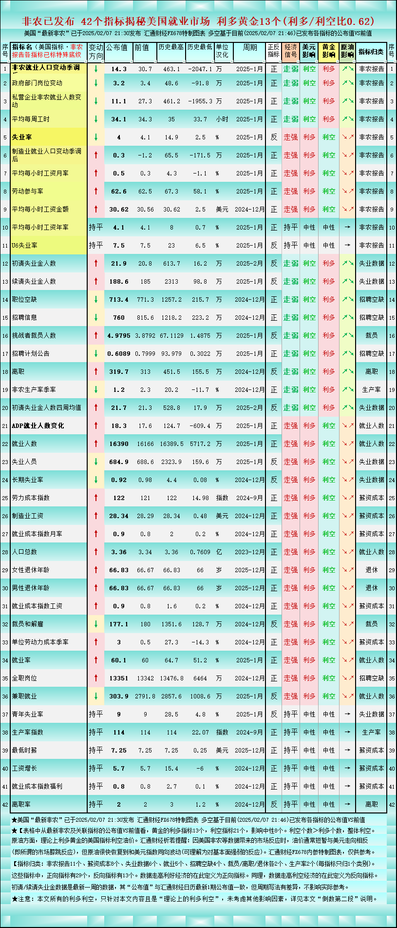 非农后一张图42个美国就业指标,对黄金利多/利空比升至0.62
