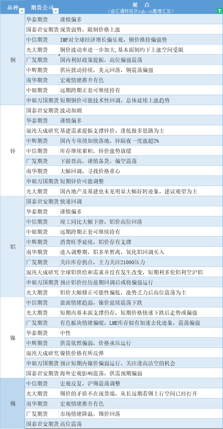 期货公司观点汇总一张图:4月18日有色系(铜、锌、铝、镍、锡等)