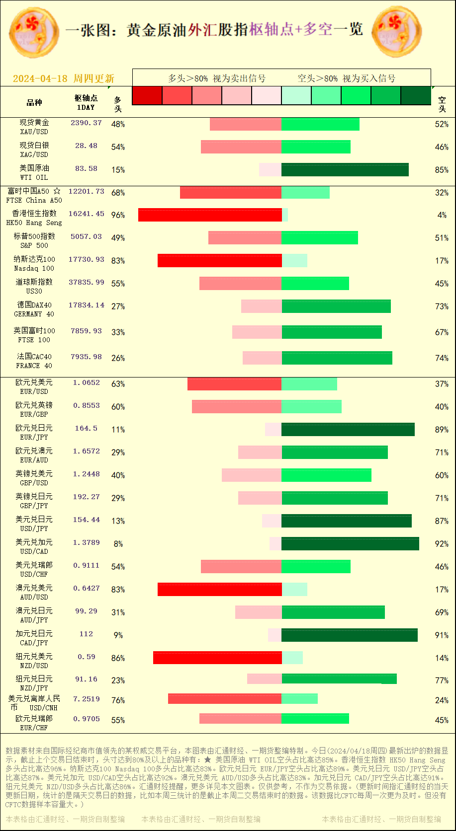 一张图:2024/04/18黄金原油外汇股指"枢纽点+多空占比"一览