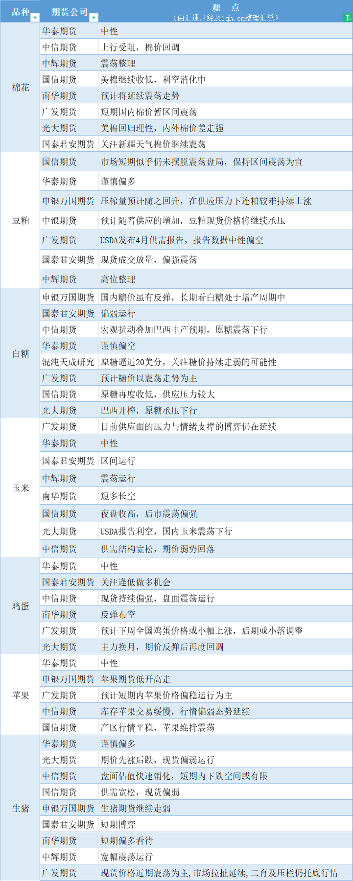 期货公司观点汇总一张图:4月15日农产品(棉花、豆粕、白糖、玉米、鸡蛋、生猪等)