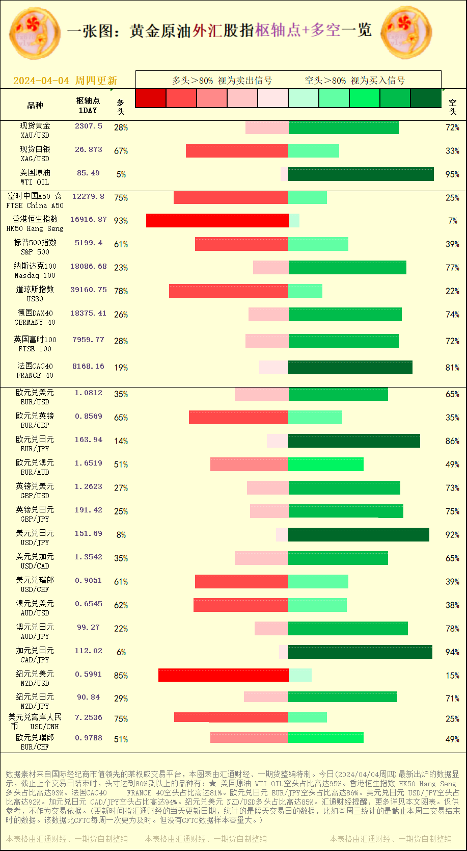 一张图:2024/04/04黄金原油外汇股指"枢纽点+多空占比"一览