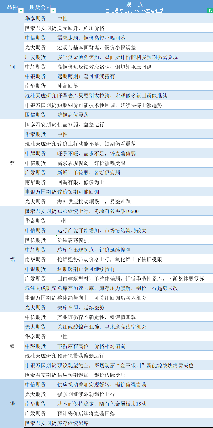 期货公司观点汇总一张图:3月25日有色系(铜、锌、铝、镍、锡等)