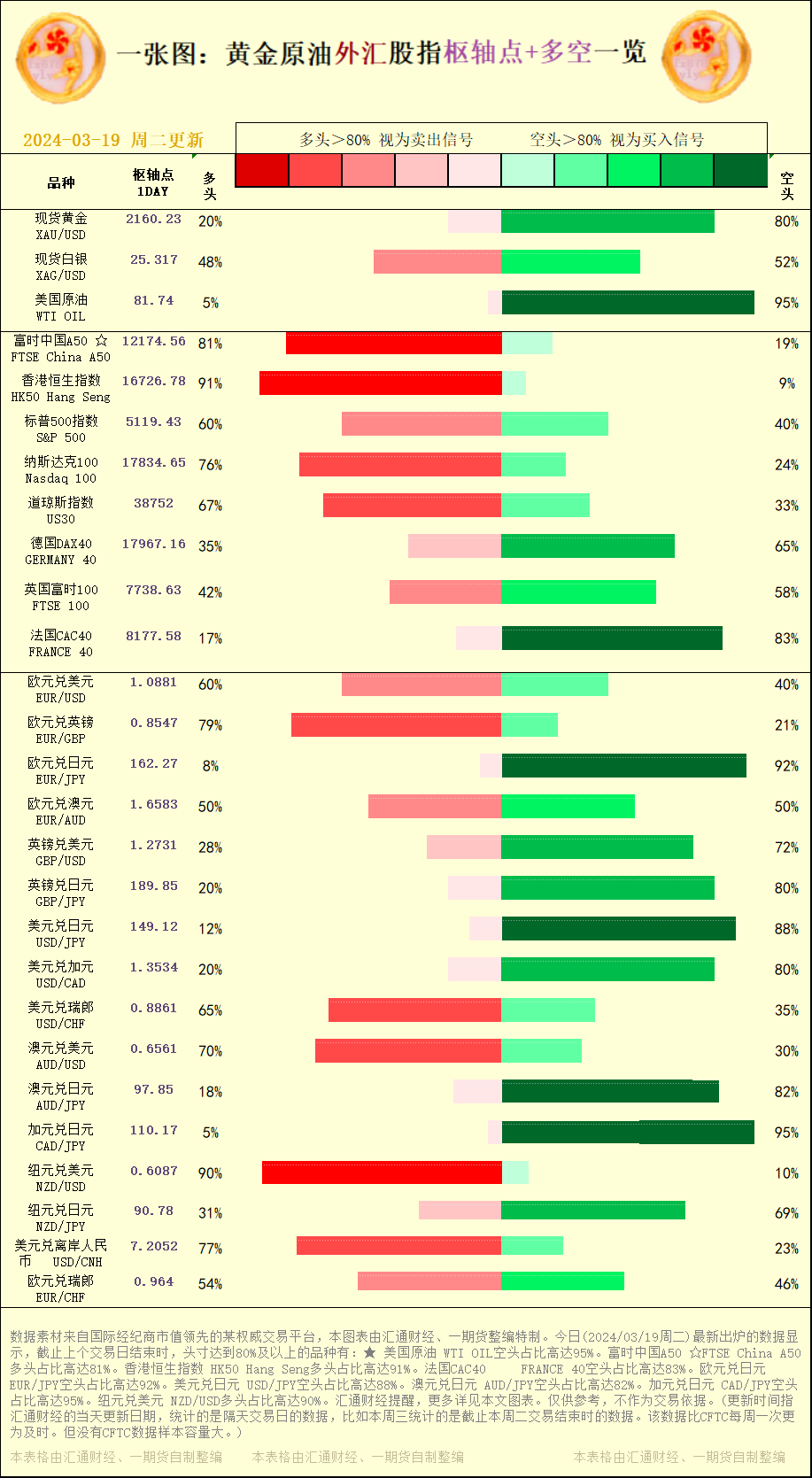 一张图:2024/03/19黄金原油外汇股指"枢纽点+多空占比"一览