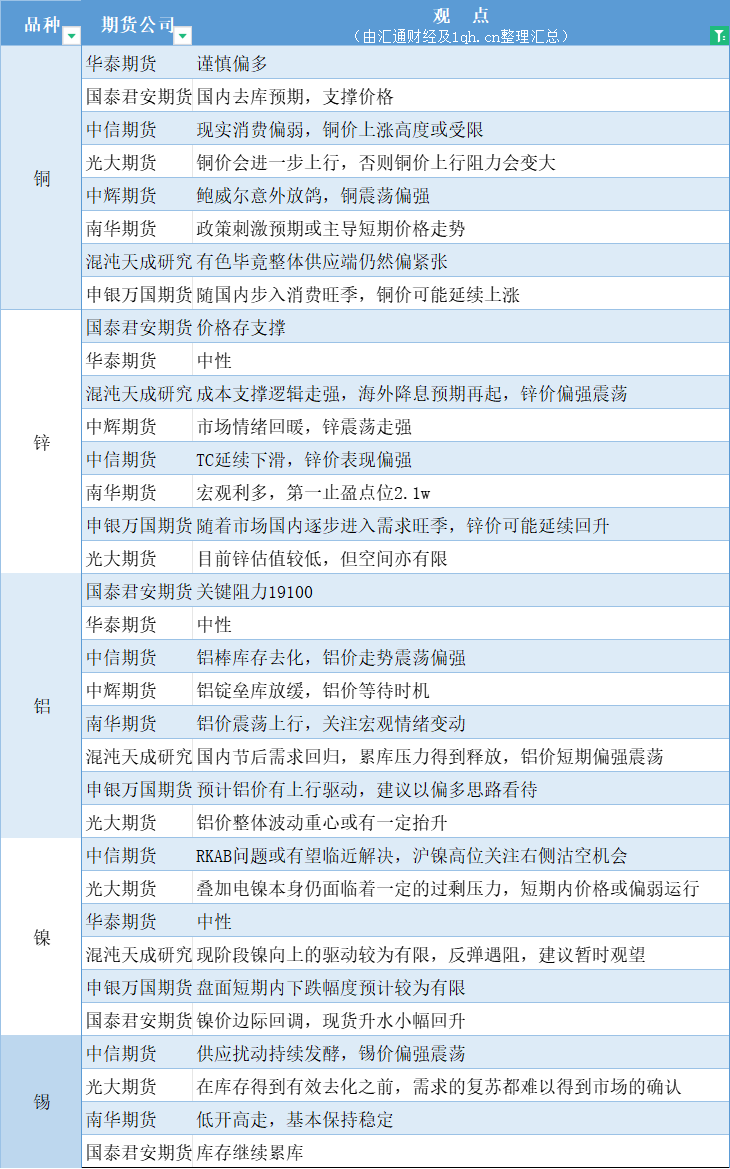 期货公司观点汇总一张图:3月7日有色系(铜、锌、铝、镍、锡等)