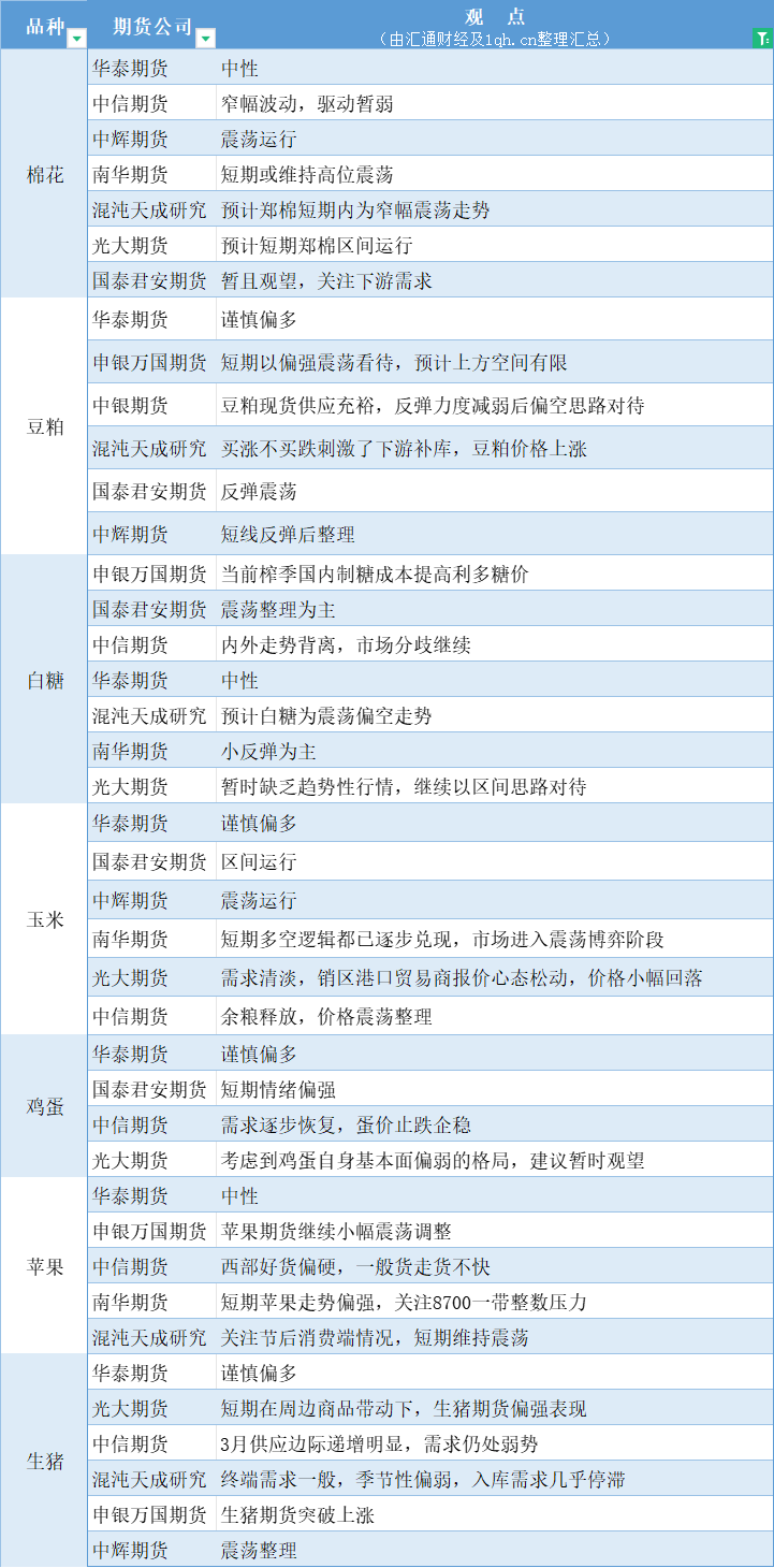期货公司观点汇总一张图:3月7日农产品(棉花、豆粕、白糖、玉米、鸡蛋、生猪等)