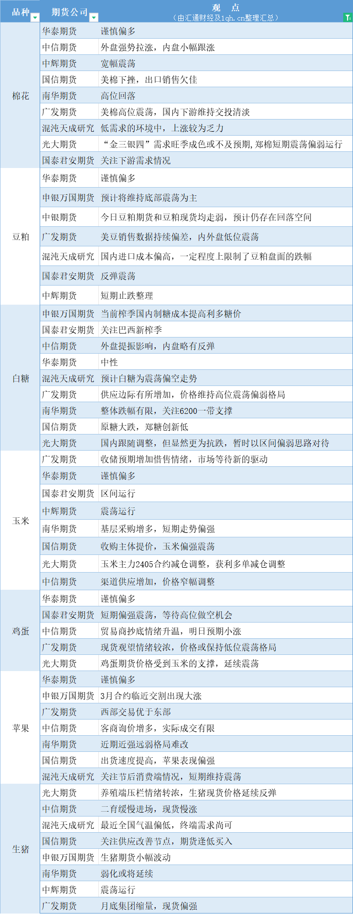 期货公司观点汇总一张图:3月1日农产品(棉花、豆粕、白糖、玉米、鸡蛋、生猪等)