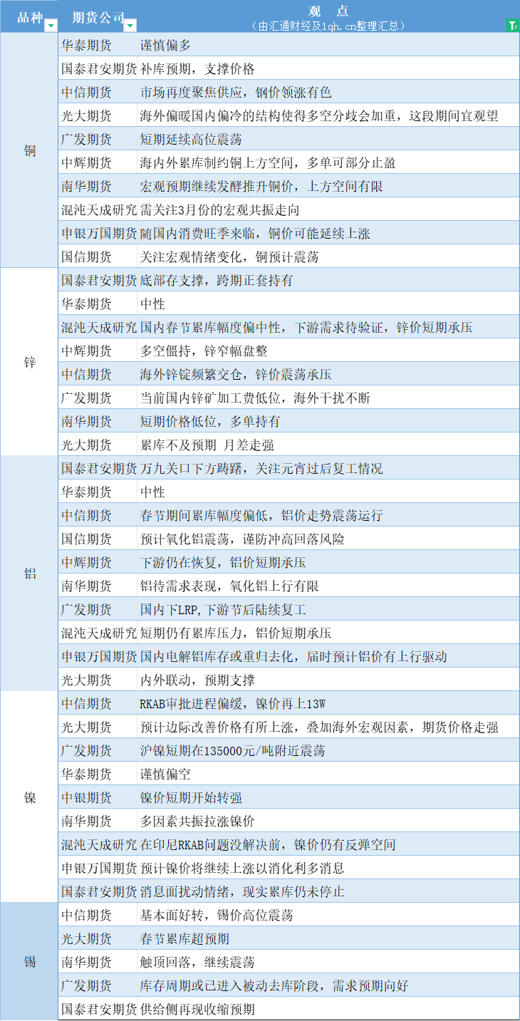 期货公司观点汇总一张图:2月26日有色系(铜、锌、铝、镍、锡等)