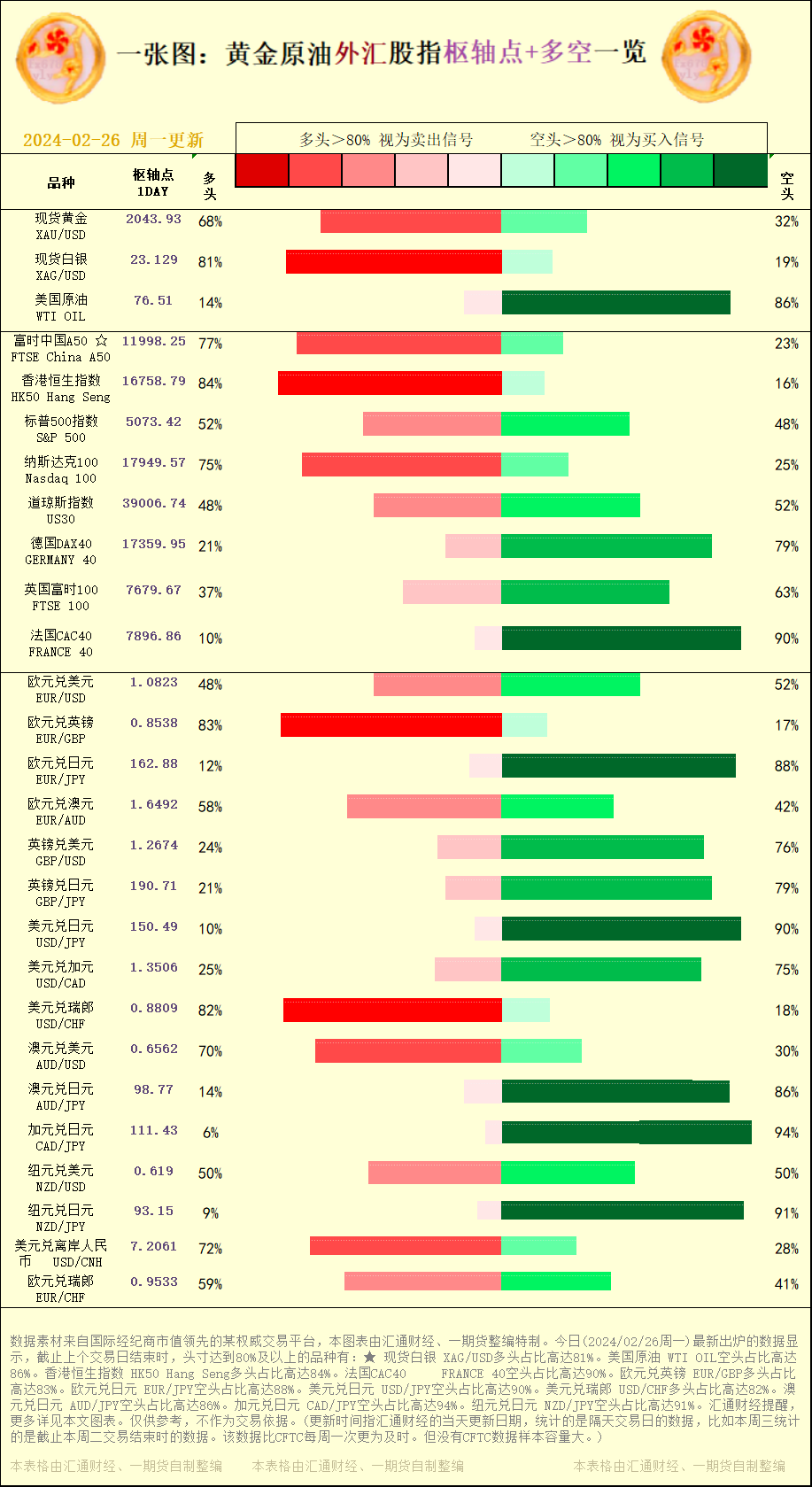 一张图:2024/02/26黄金原油外汇股指"枢纽点+多空占比"一览