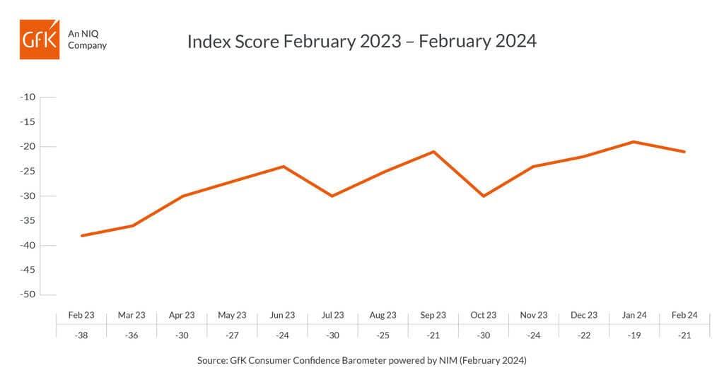 英国消费者信心复苏略有停滞,2月Gfk消费者信心指数降至-21