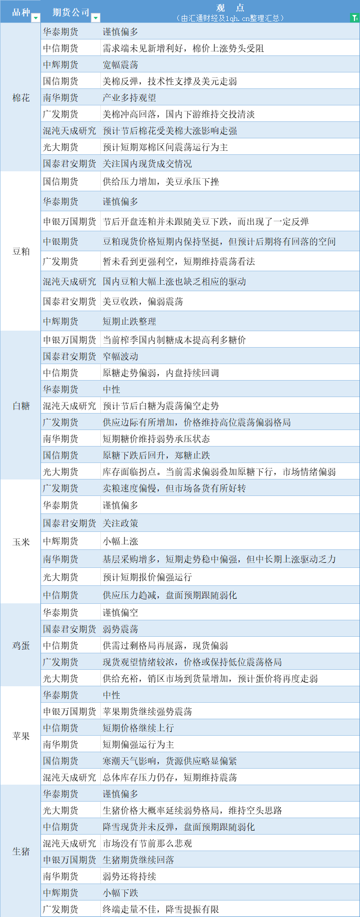 期货公司观点汇总一张图:2月22日农产品(棉花、豆粕、白糖、玉米、鸡蛋、生猪等)