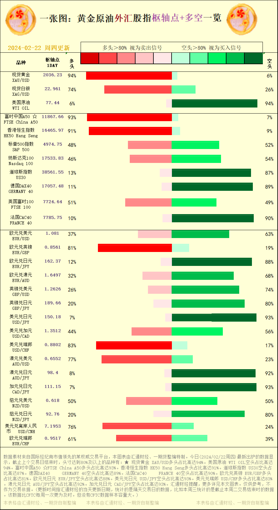 一张图:2024/02/22黄金原油外汇股指"枢纽点+多空占比"一览