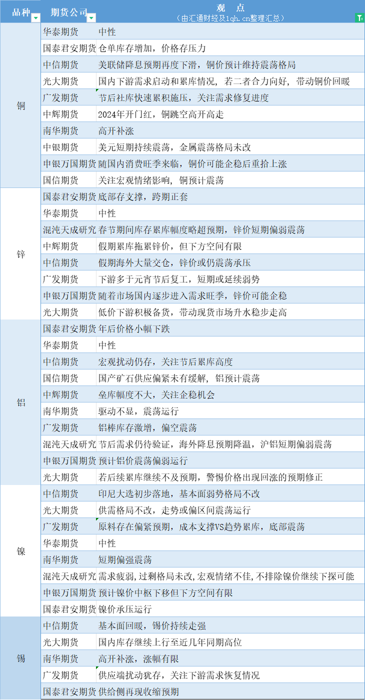 期货公司观点汇总一张图:2月20日有色系(铜、锌、铝、镍、锡等)