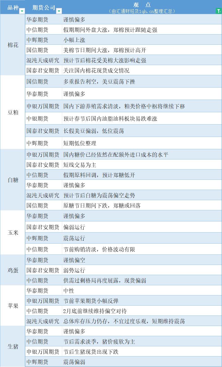 期货公司观点汇总一张图:2月19日农产品(棉花、豆粕、白糖、玉米、鸡蛋、生猪等)