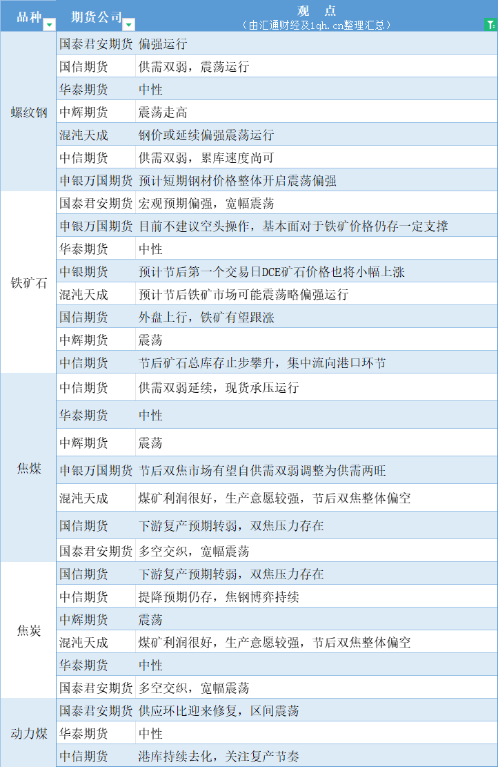 期货公司观点汇总一张图:2月19日黑色系(螺纹钢、焦煤、焦炭、铁矿石、动力煤等)
