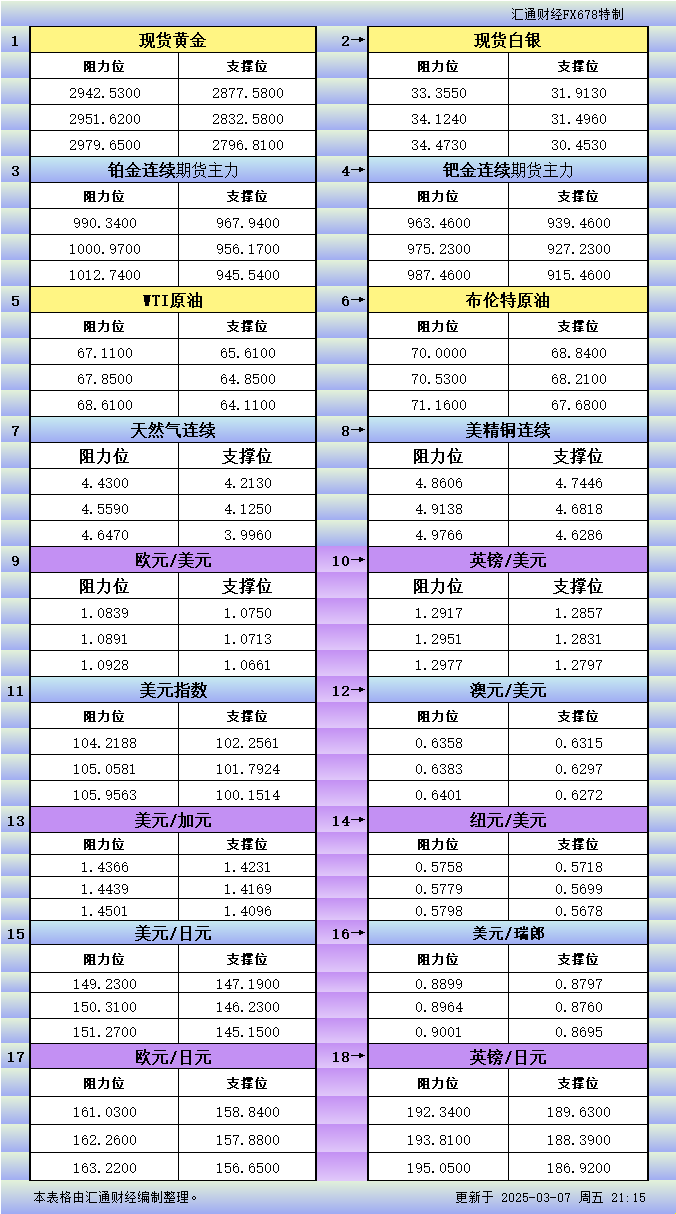 3月7日美市更新支撑阻力:18品种支撑阻力(金银铂钯原油天然气铜及十大货币对)