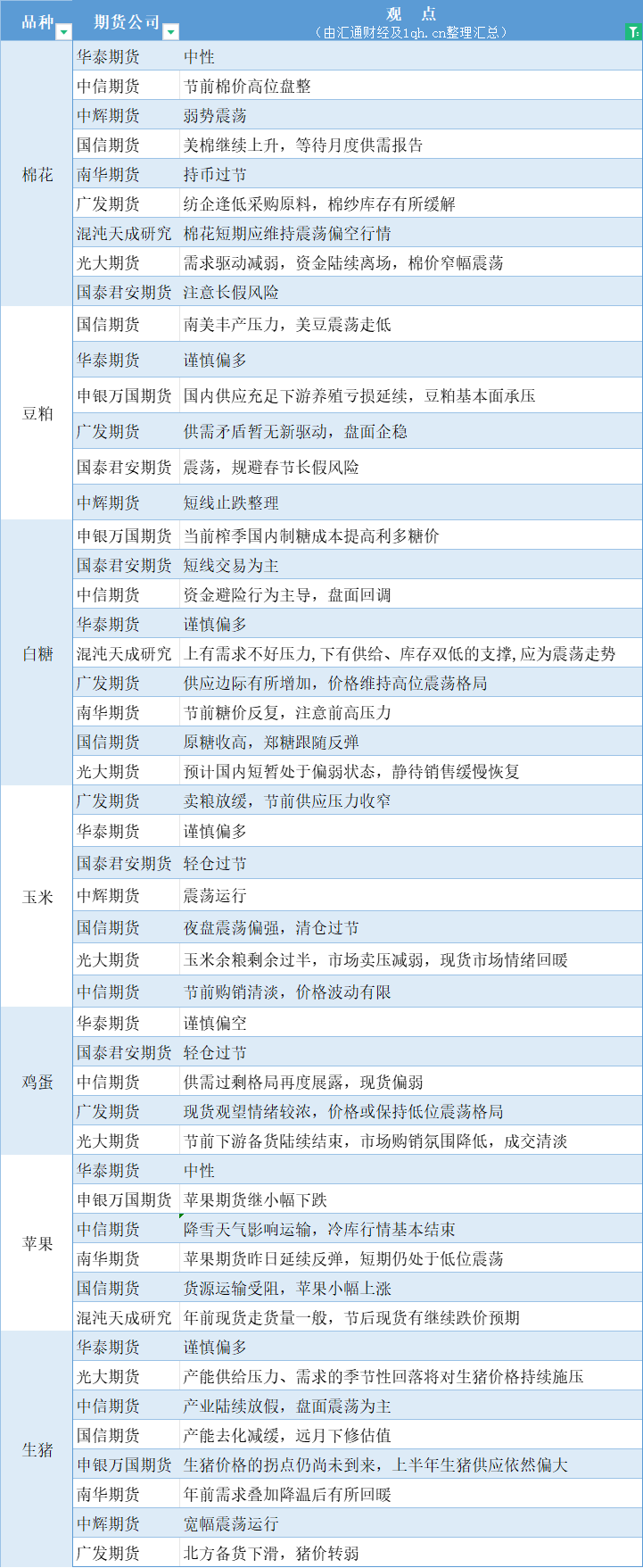 期货公司观点汇总一张图:2月8日农产品(棉花、豆粕、白糖、玉米、鸡蛋、生猪等)