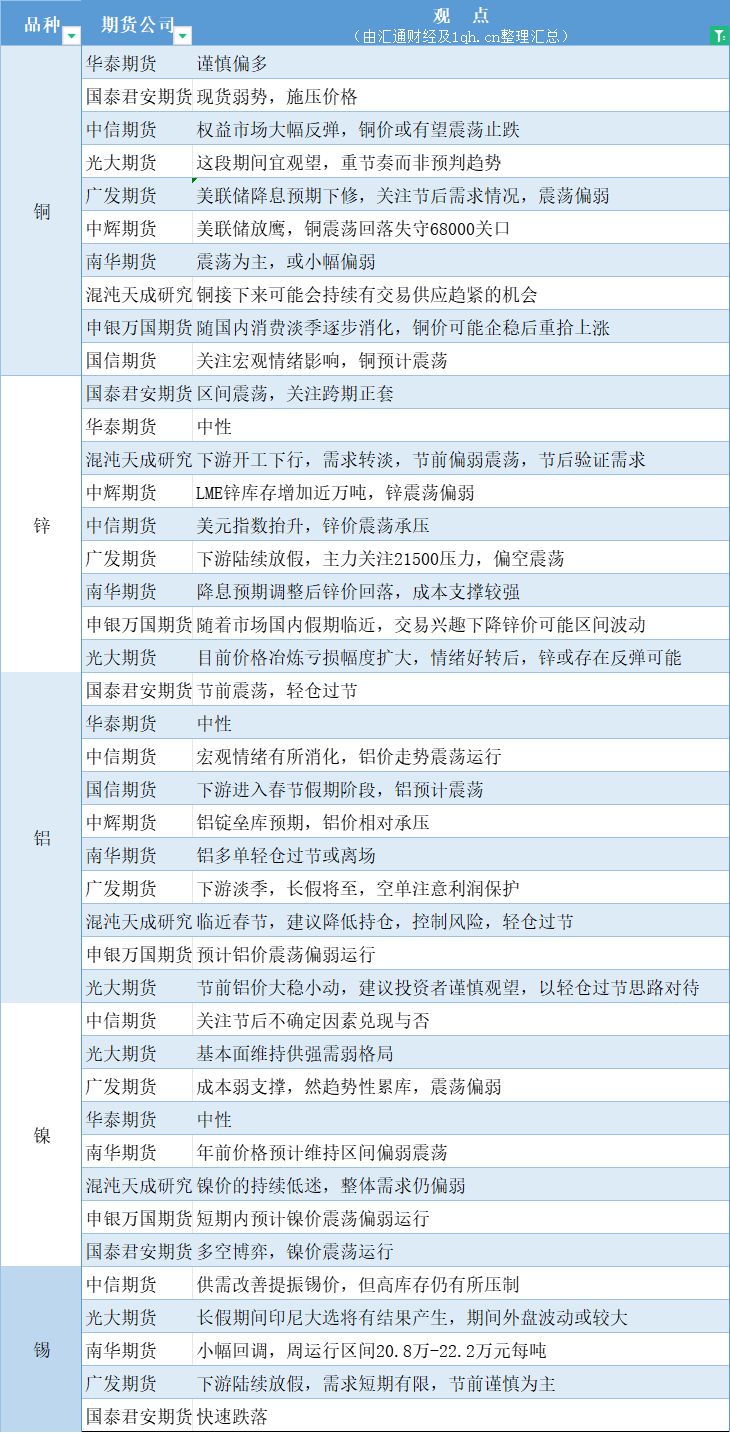 期货公司观点汇总一张图:2月8日有色系(铜、锌、铝、镍、锡等)