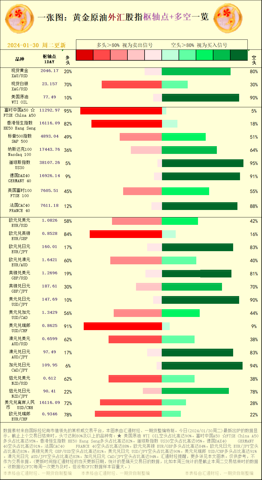 一张图:2024/01/30黄金原油外汇股指"枢纽点+多空占比"一览