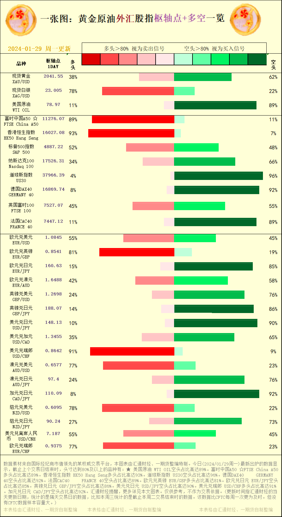 一张图:2024/01/29黄金原油外汇股指"枢纽点+多空占比"一览