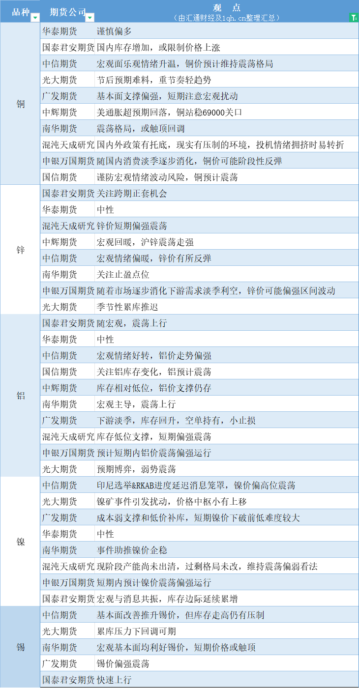 期货公司观点汇总一张图:1月29日有色系(铜、锌、铝、镍、锡等)