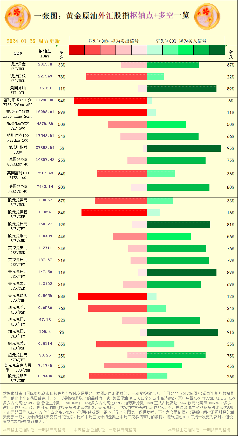 一张图:2024/01/26黄金原油外汇股指"枢纽点+多空占比"一览