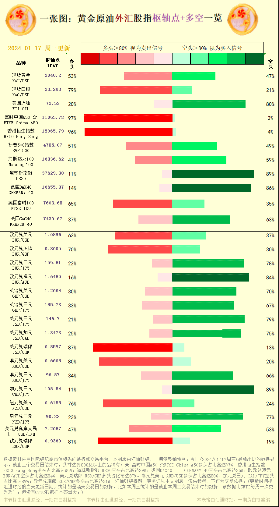一张图:2024/01/17黄金原油外汇股指"枢纽点+多空占比"一览