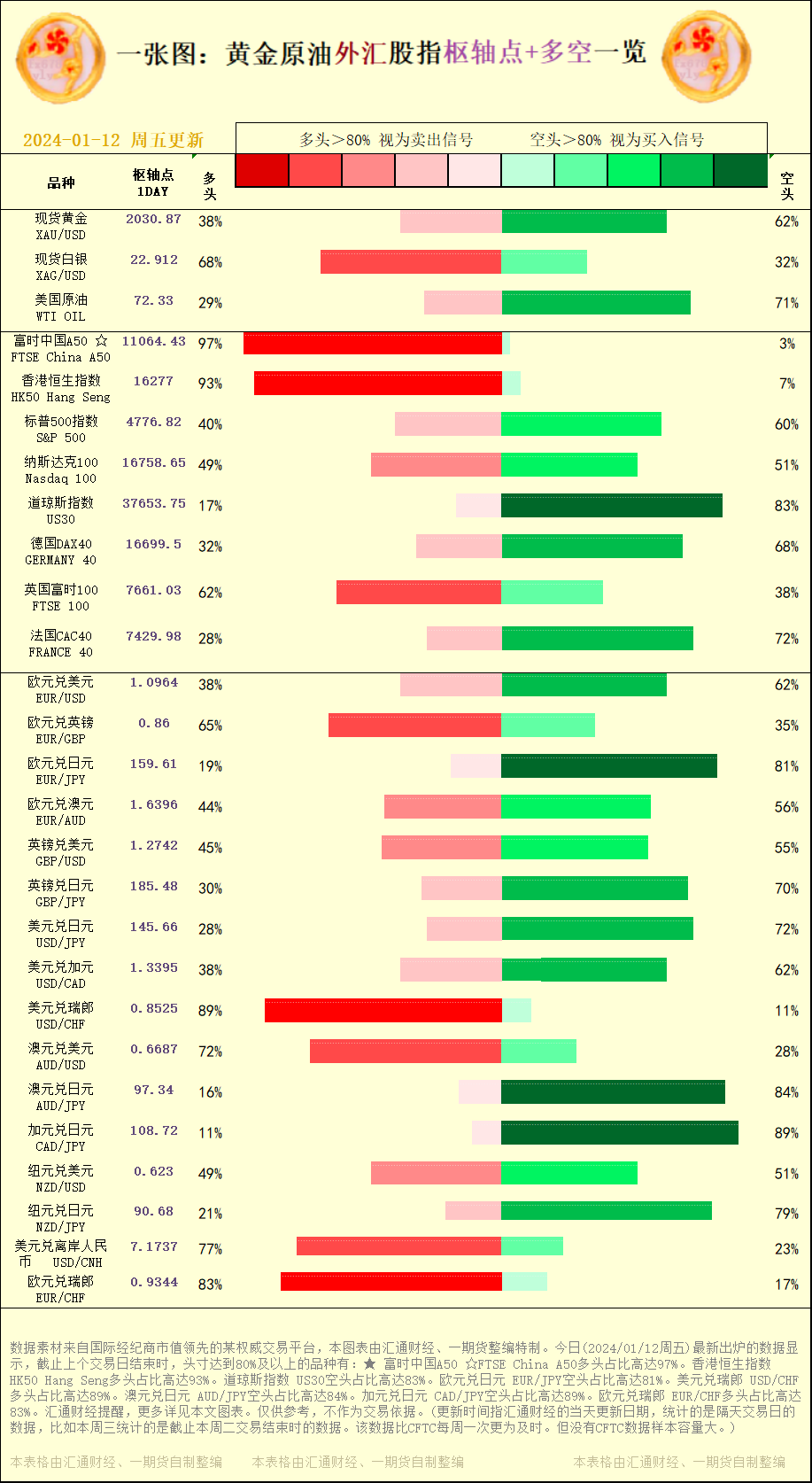 一张图:2024/01/12黄金原油外汇股指"枢纽点+多空占比"一览