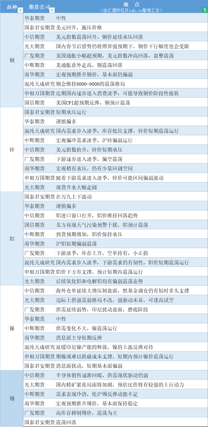 期货公司观点汇总一张图:1月12日有色系(铜、锌、铝、镍、锡等)