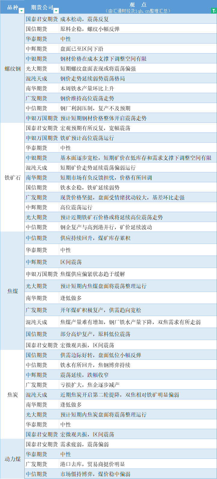 期货公司观点汇总一张图:1月12日黑色系(螺纹钢、焦煤、焦炭、铁矿石、动力煤等)