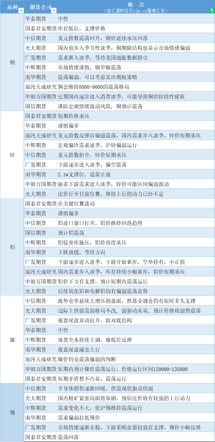 期货公司观点汇总一张图:1月11日有色系(铜、锌、铝、镍、锡等)