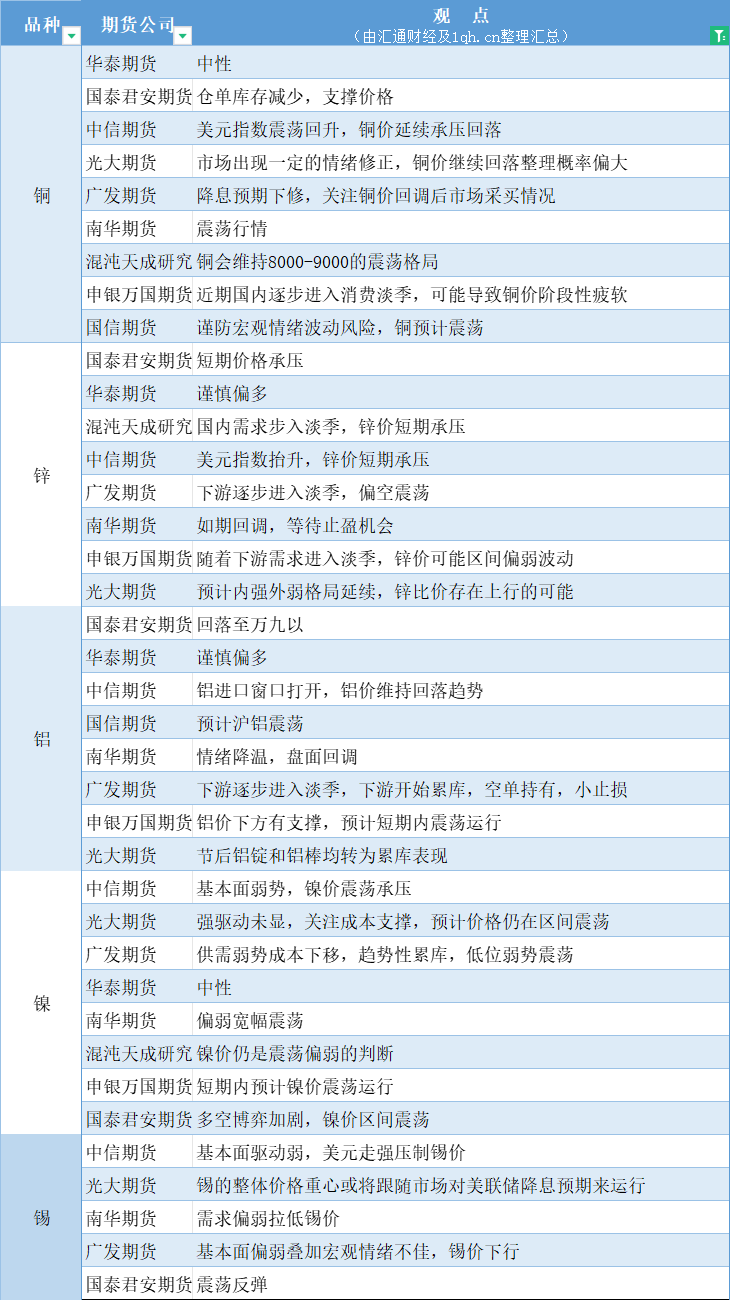 期货公司观点汇总一张图:1月9日有色系(铜、锌、铝、镍、锡等)