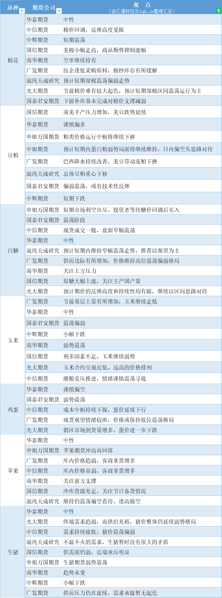 期货公司观点汇总一张图:1月9日农产品(棉花、豆粕、白糖、玉米、鸡蛋、生猪等)
