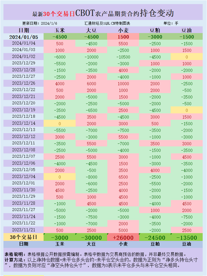 CBOT持仓解读:新年第一周,基金增加小麦、玉米、大豆投机性净空头头寸